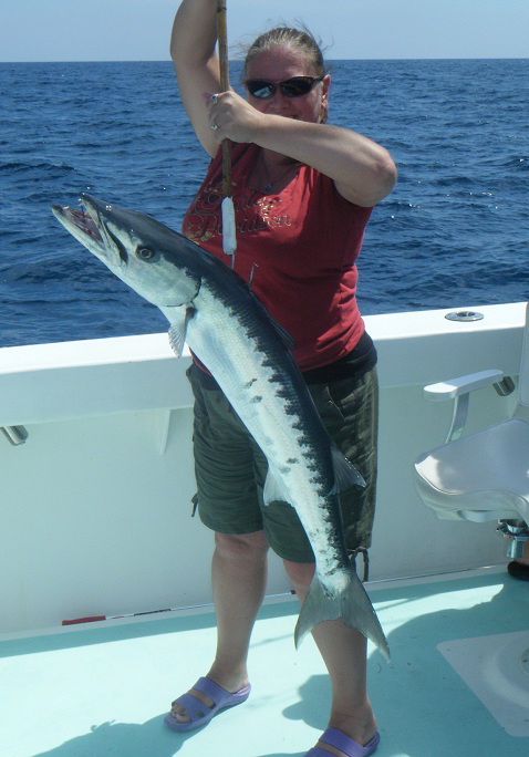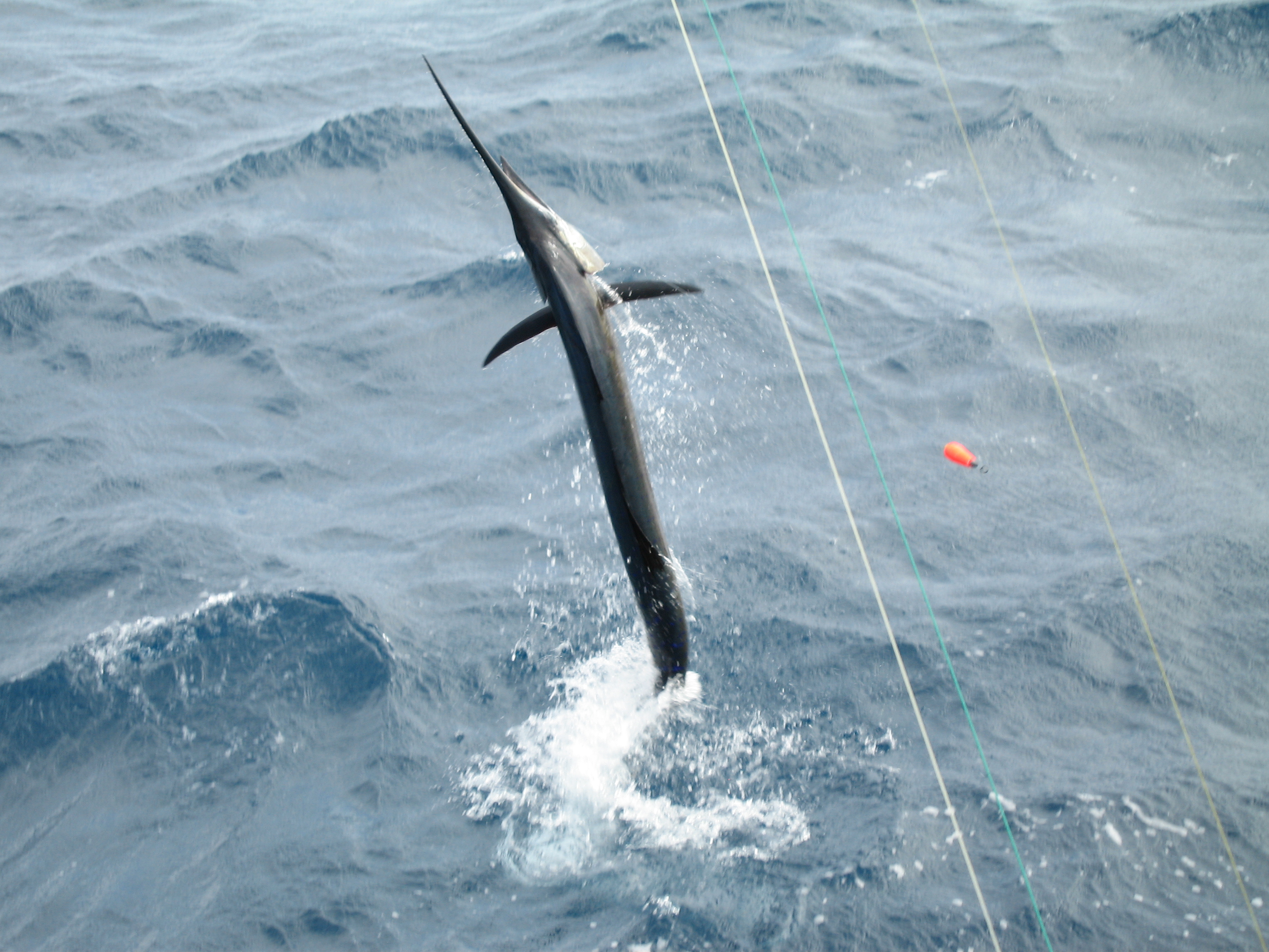 We fish a two kite spread with three baits on each kite as long as the conditions will allow, just the right wind speed and direction. With six live baits spread out and organized on the surface behind the boat, it’s a deadly tactic. We use light line, mostly 20 – 30 lb line with light 50 or 60 pound leaders. When the “toothy critters” Kings, Barracuda & Sharks are around we will use a small trace of light #4 to #6 wire leader to prevent cut off’s. Hooks we choose are circle hooks or small light wire J-